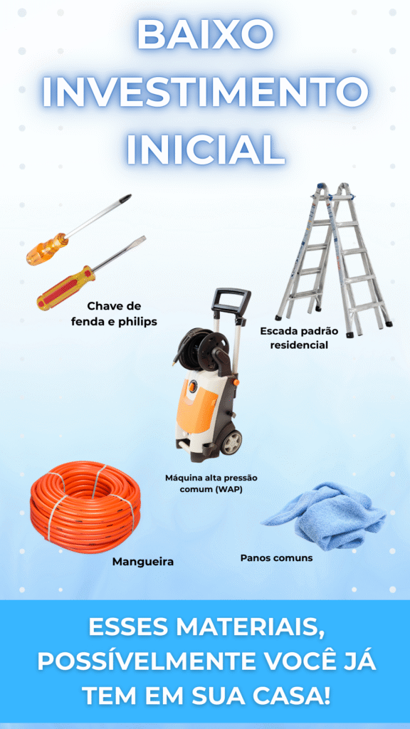 Muitos dos equipamentos você já tem em sua casa, como, panos, mangueira, escada, máquina de alta pressão, etc.